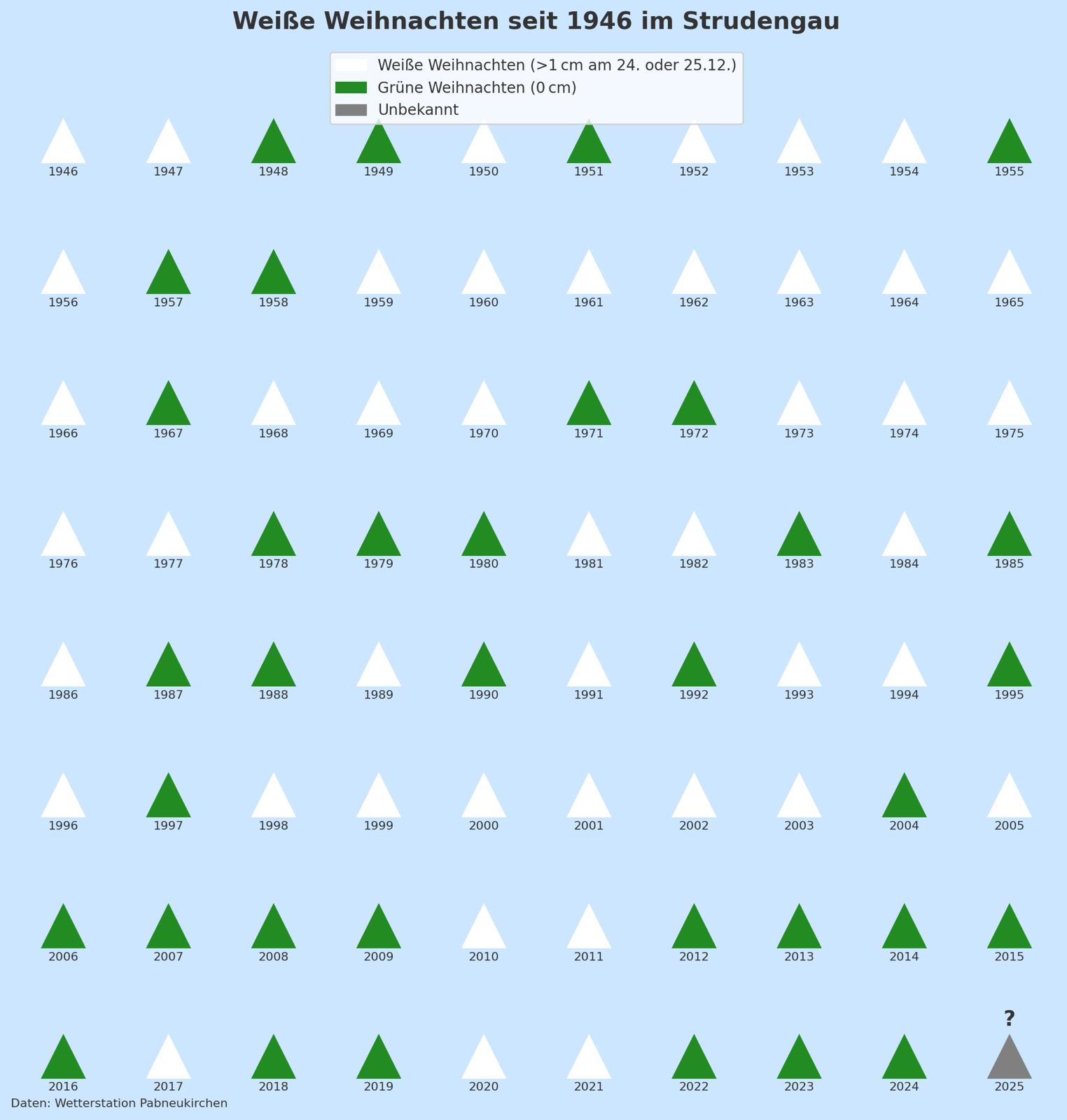 Alle Werte stammen von der offiziellen und privaten Wetterstation Pabneukirchen und umfassen den Zeitraum von 1946 bis 2024. Als weiße Weihnachten gilt eine geschlossene Schneedecke mit mehr als 1 cm Höhe, gemessen jeweils am 24. und 25. Dezember.