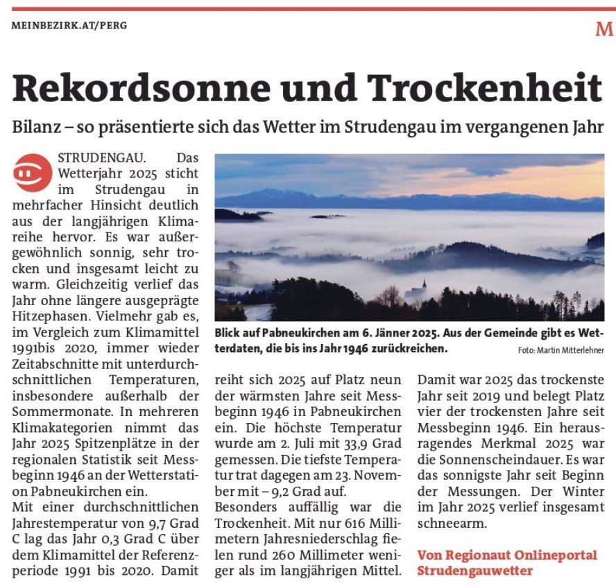 • Ein außergewöhnlich sonniges und sehr trockenes Jahr im Strudengau – Jahresrückblick Wetter 2025
